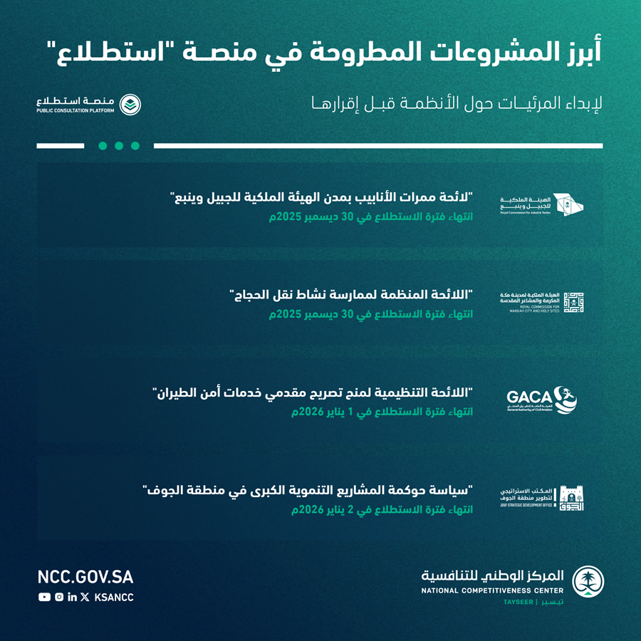 من جانبها طرحت الهيئة الملكية لمدينة مكة المكرمة والمشاعر المقدسة عبر المنصة مشروع (اللائحة المنظمة لممارسة نشاط نقل الحجاج)؛ بهدف تنظيم ممارسة نشاط نقل الحجاج بما يضمن سلامتهم وموثوقية الخدمات المقدمة لهم، وينتهي الاستطلاع على المشروع بتاريخ 30 ديسمبر 2025م.