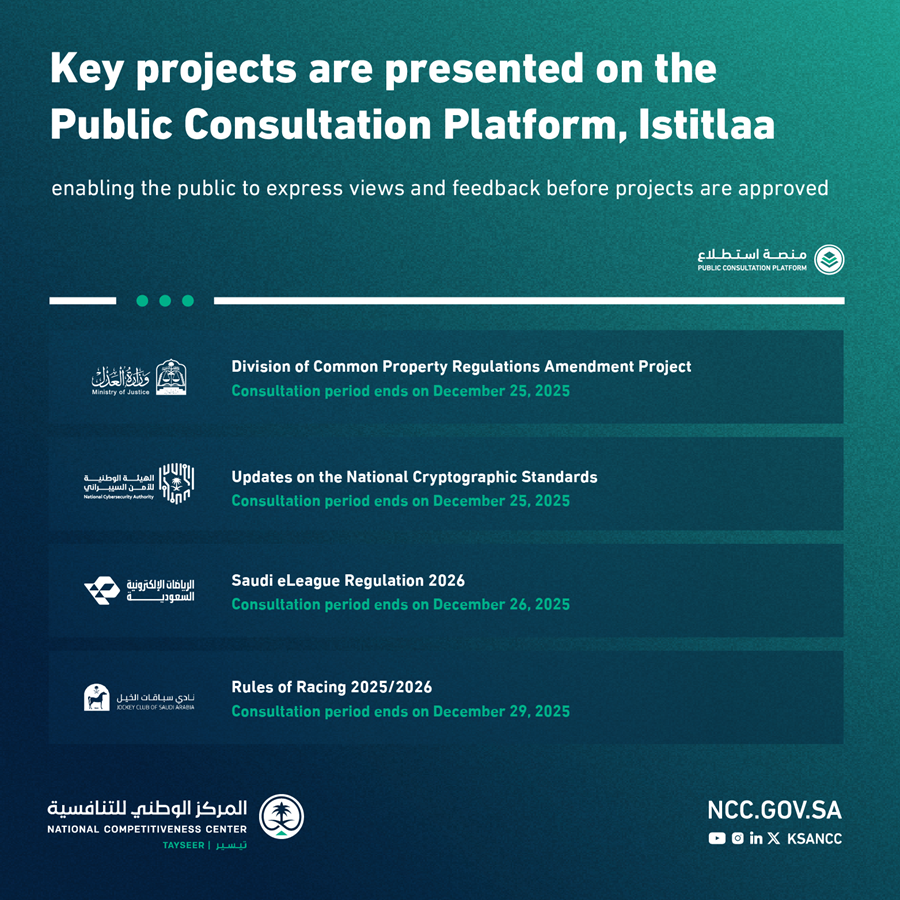 The National Competitiveness Center's Public Consultation Platform, Istitlaa, has put forward 25 projects related to economic and development affairs. In cooperation with 18 government bodies, the NCC invites the general public, government entities, and the private sector to express their views and feedback on projects prior to their approval.