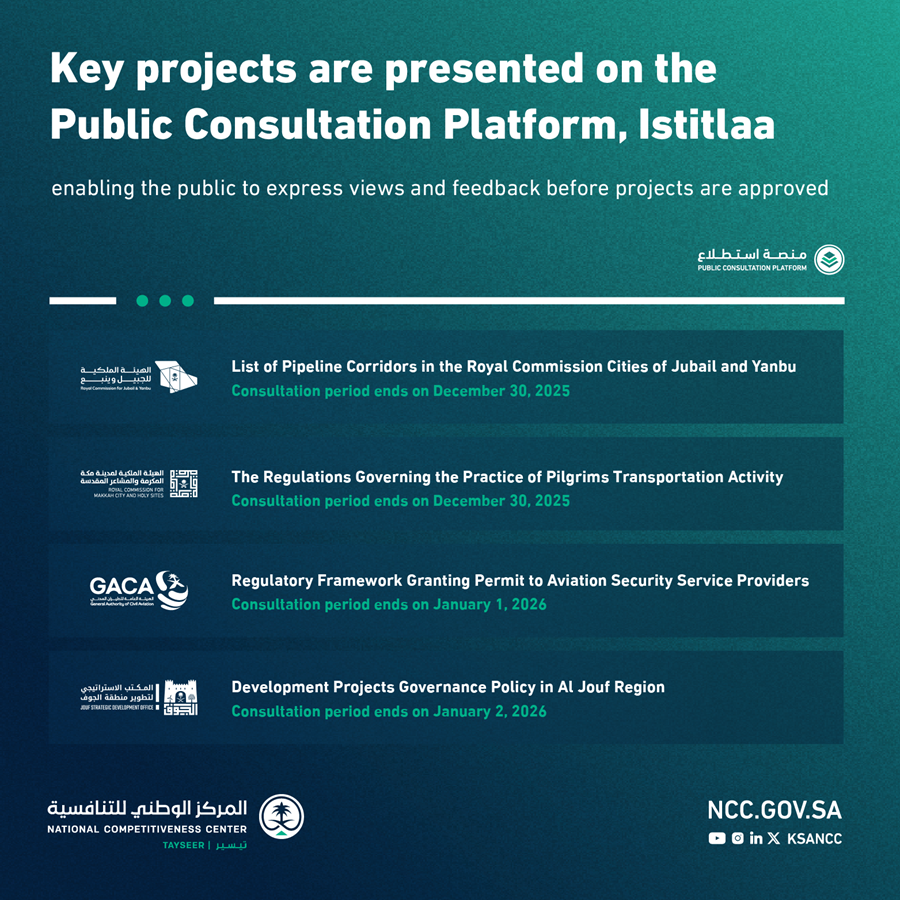 The National Competitiveness Center's Public Consultation Platform, Istitlaa, has put forward 22 projects related to economic and development affairs. In cooperation with 15 government bodies, the NCC invites the general public, government entities, and the private sector to express their views and feedback on projects prior to their approval.